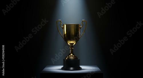 Shiny gold trophy on a black base illuminated by a spotlight against a dark background award