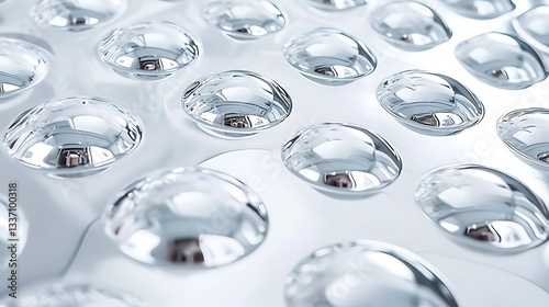 Shiny water drops on a smooth surface, refracting light; for beauty, science, or backgrounds