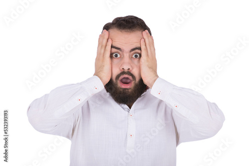 30s, arab, brazilian, egyptian, horizontal, man, adult, amazed, anxious, arabian, astonished, background, beard, canadian, closeup, east, eastern, egypt, emotion, face, forward, guy, head, hispanic, iraqi, isolated, latin, looking, middle, mouth, moustache, negative, news, open, panic, people, person, portrait, putting, shirt, shocked, speechless, surprised, unhappy, unshaved, white, worry, young