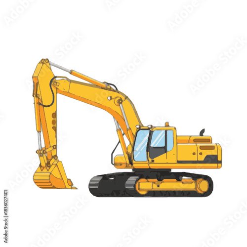 Side view of a yellow hydraulic excavator, a powerful piece of heavy construction machinery used for digging and earthmoving, isolated illustration