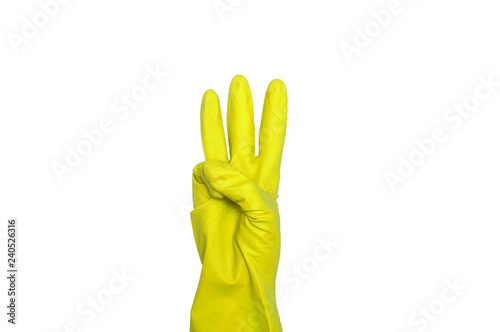 Signs made of yellow protective gloves. Fingers symbol three. Isolated on white. The concept of cleanliness and order.