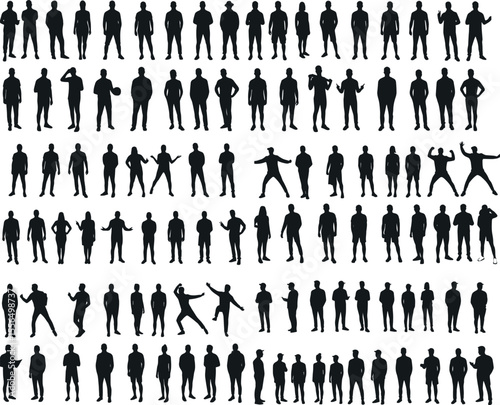 Silhouette collection of diverse people in various poses standing and in action on a white background
