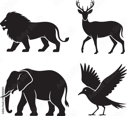 silhouette, lion, elephant, cervid, stag, antler, bird, crow, raven, wing, flying, wildlife, animal, safari, nature, mammal, avian, creature, icon, symbol, graphic, design, illustration, black-and-white, vector, outline, zoo, forest, savanna, africa