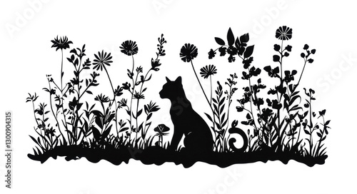 Silhouette of a cat amidst wildflowers in a serene garden setting for nature lovers, cut out