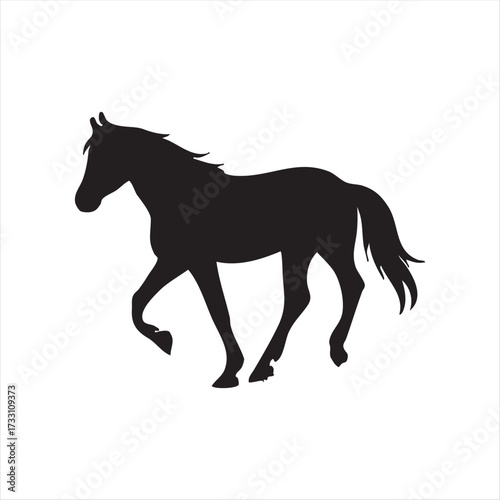 Silhouette of a majestic horse in motion, captured in a bold black graphic against a clean white background, perfect for equestrian themes