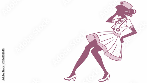 nurse, silhouette, uniform, stethoscope, cap, posing, elegant, white background, health care, medicals, professional, woman, female, doctor, clinic, hospital, health, care, medicine, illustration, artwork, drawing, design, style, fashion, beauty, graceful, pose, figure, body, leg, dress, heel, shoe, hat, head, arm, hand, gesture, profile, half face, isolated, clip art, graphic, vector, art, person
