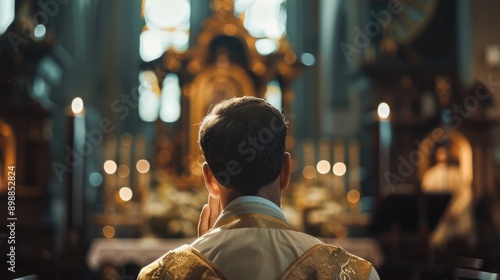Silhouette of a priest in prayer during a religious service, evoking themes of devotion and the sacred.