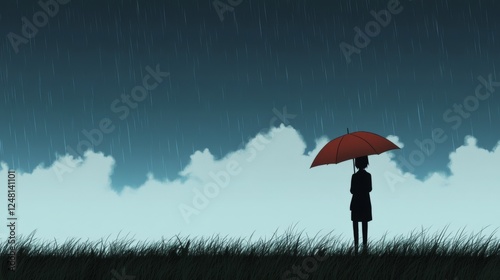 rain, umbrella, person, silhouette, cloud, sky, dark, sad, thoughtful, nature, weather, storm, alone, sorrowful, depression, rainy, outdoors, girl, boy, adult, children, standing, grass, field, calm, peaceful, moment, emotional, isolated, lonely, melancholy, stormy, mood, downcast, pensive, cloudscape, exterior, dramatic, lighting, rainy day, dramatic sky, landscape, quiet
