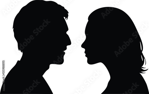 Silhouette of Young Man and Woman Faces Looking at Each Other in Profile Over White
