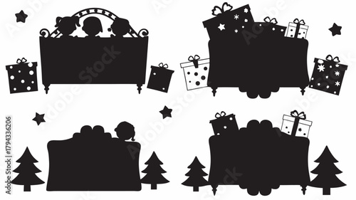 silhouette, children, furniture, gift, christmas tree, festive, arrangement, star, holiday, celebration, winter, season, decoration, ornament, present, package, ribbon, bow, tree, pine, evergreen, bed, couch, sofa, children, children, girl, boy, star, pattern, design, graphic, illustration, vector, clip art, artwork, drawing, image, icon, symbol