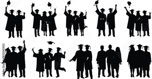 Silhouettes of happy graduates celebrating together in caps and gowns, symbolizing achievement, education success, teamwork, friendship, and academic milestone celebration