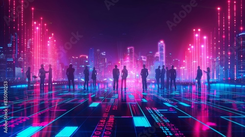 Silhouettes of people amidst glowing digital cityscape with futuristic neon lights and data streams, depicting advanced technology and connectivity.