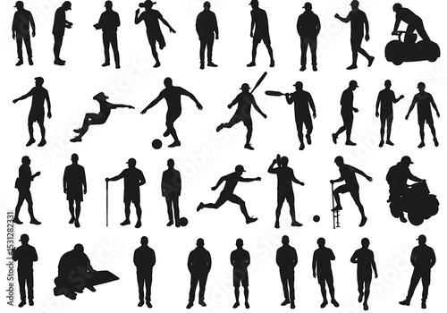 silhouette, people, man, activity, sport, person, male, action, group, standing, illustration, black, white, isolated, background, soccer, baseball, golf, running, walking, sitting, motorcycle, bat, ball, player, team, exercise, lifestyle, leisure, athlete