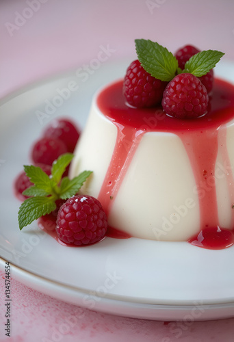 Silky Italian Panna Cotta Topped with Raspberry Sauce and Mint