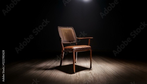 Silla en un espacio aislado y oscuro, iluminación dramática y una luz centrada