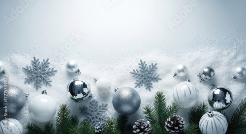 christmas, ornament, bauble, snow, winter, holiday, festive, blue, silver, frost, garland, decor, elegant, luxury, celebration, new year, seasonal, background, copy space, retail, hospitality, gift, promo, card, bokeh