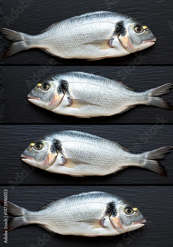 fish, seafood, dorado, sea bream, marin, ocean, aquatic, scale, gill, fin, tail, body, raw, fresh, uncooked, whole, silver, grey, white, dark, background, food, ingredient, cookery, culinary, diet, healthy, protein, nourishment, delicacy, market, texture, pattern