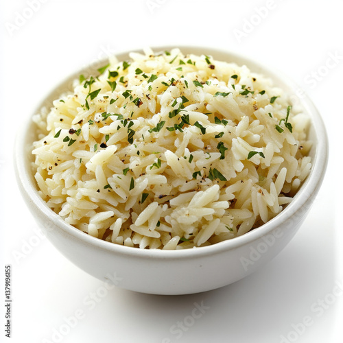 Simple Rice Dish in Bowl: A culinary close-up of a pristine, cooked rice dish, presented in a white ceramic bowl, evoking simplicity and wholesome dining.