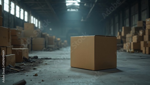 Single Cardboard Box in Abandoned Warehouse, Industrial Setting, Logistics Concept