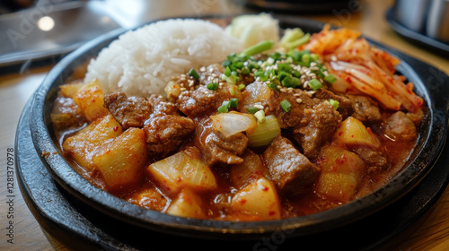 rice, kimchi, beef, vegetable, sizzling, dish, korean, meal, food, cookery, spicey, savoury, plate, garnish, onion, potato, sesame, green onion, hot, traditional, eatery, dining, delicious, cooked, side dish, hearty, asian, culinary, epicure, appetising, fresh, colourful, comfort food, serving, bowl, favor, receipe, ingredient, lunch, dinner, platter, tasty, aromatic, homemade