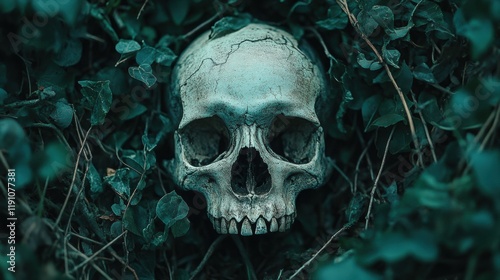 Skull Surrounded by Green Leaves on a Dark Forest Floor