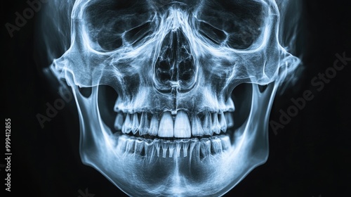 Skull x-ray with jaw and teeth clearly visible, 3D illustration