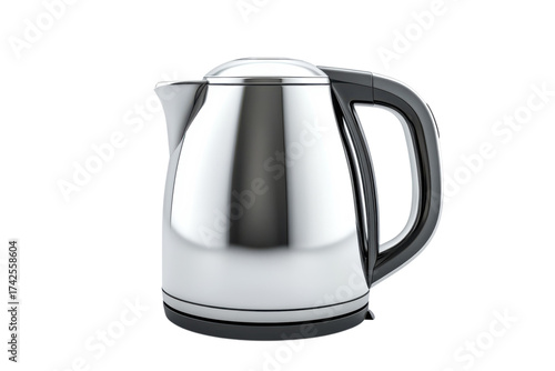 Sleek electric kettle with a polished chrome finish and black handle for kitchen appliance ads on transparent background