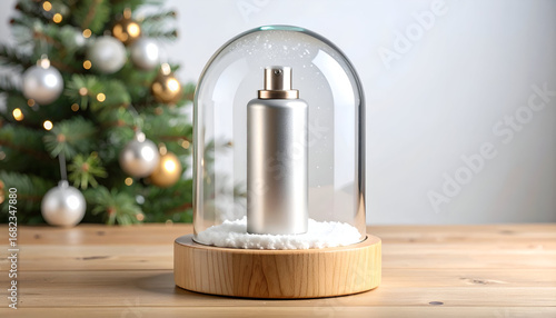 Sleek silver product mockup displayed in a glass cloche, resting on a wooden table with a festive Christmas tree backdrop, ideal for seasonal gift ideas
