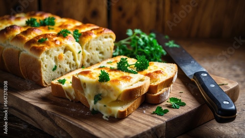 Sliced garlic bread with herbs on wooden cutting board next to knife. Baked bread with melted butter and parsley. Rustic kitchen setting.