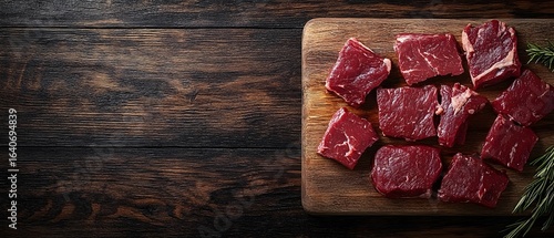 Sliced raw�venison�deer meat�for a�stew�on a�butcher's cutting board.