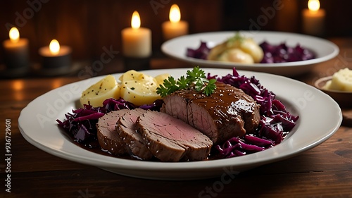 Sliced Roast Beef with Red Cabbage and Potatoes