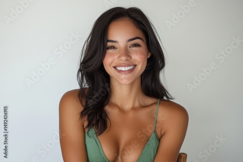 Slim latin woman in green underwear sitting on chair and smiling over white studio background, demonstrating perfect body shape