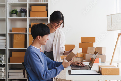 Small business owners couple entrepreneurs working with parcel, e-business, marketing, online shop, sme, entrepreneurs