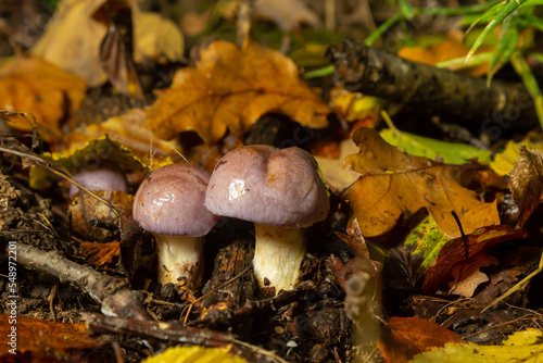Small Gassy webcap, Cortinarius traganus, poisonous mushrooms in forest close-up, selective focus, shallow DOF