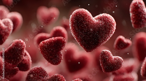 Small hearts flying and joining into big heart over warm red background with dreamy glow