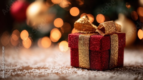 small red xmas present package with golden glitter bow on floor under merry christmas tree bokeh festive background giftbox as holiday shopping store sale happy new year eve season gift box concept n