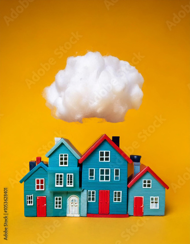Small turquoise houses with red windows and doors against yellow background above a small cotton wool cloud