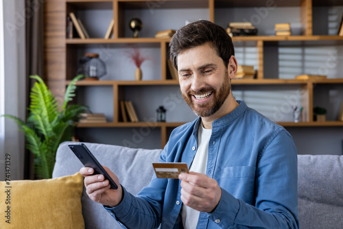 shopping, online, smartphone, credit card, man, smile, smiling, happy, e-business, home, casual attire, cyberspace, technology, adult, purchase, lifestyle, consumer, sitting, living room, comfortable, transaction, banking, digital, male, buy, retail, electronic, payment, cheerful, secure, commerce, user, connectivity, order, modern, financial, comfort, indoor, furniture, house, credit, client, wireless