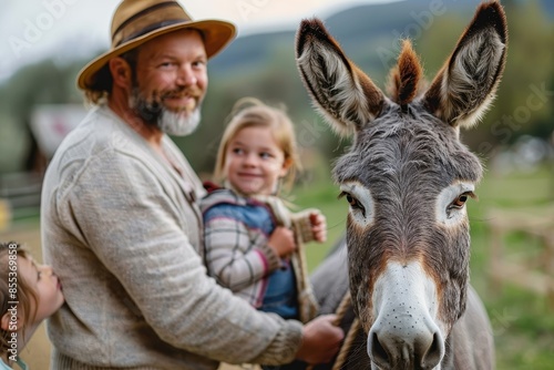 family, bonding, farm, donkey, children, man, smiling, children, animal, nature, rustic, happiness, fatherhood, interaction, outdoors, countryside, casual attire, affection, relaxed, domestic animals, heritage, togetherness, joy, kinship, traditional, care, farm animal, rural, connection, adult, gentle, love, playfulness, casual clothes, leisure, oneness, father, gleeful, pet