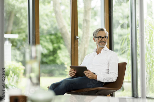 Smiling man with tablet sitting on chair in his living room