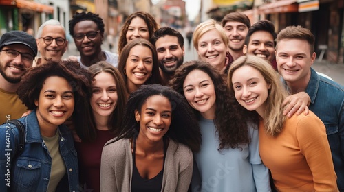 Smiling people of different peoples and cultures stand together, the concept of friendship of peoples.