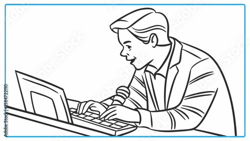 man, speaker, presentation, laptop, microphone, dais, conference, event, talking, typing, communication, technology, business, education, lecture, seminar, professional, smile, happy, confident, line art, illustration, drawing, black-and-white, outline, vector, simple, minimalist, graphic, doodle, learning, teaching, training, workshop, meeting, interview, broadcast, news, media, corporate, executive, leadership