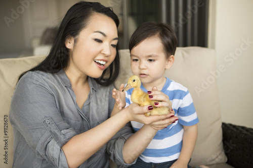 stroking, sitting, learning, holding, chinese, kindergartner, female, adult, woman, male, boy, family, son, eltern, mother, care, curiosity, cute, enjoyment, quality time, togetherness, well-being, happiness, yellow, fluffy, smiling, us, texas, animal, baby animal, duckling, brown hair, casual clothes, indoor, animal themes, pet, domestic life, nature