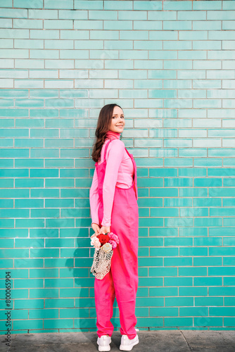 smiling, woman, holding, rose, looking, shoulder, 1, copy space, people, adult, england, britain, outdoors, day, dungarees, beautiful, rose, flower, plant, minimalist, bright, colours, tiled, wall, surprise, mid, caucasian, blue, lifestyle, nature, brick, hiding, place, pink, magenta, female
