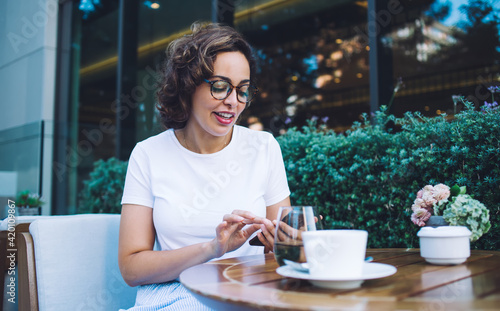 woman, cheerful, using, smartphone, browsing, cafeteria, cosy, text message, coffee break, cafes, content, cafes, trendy, device, smart, modern, urban, surfing, mobile phone, beverage, hot drink, contraption, phone, mobile, female, young, terrace, online, communicate, connection, happy, free time, charming, social network, text message, enjoy, eatery, veranda, glad, app, pastime, positive, style, cyberspace, summer, attractive, network, horizontal, outdoors