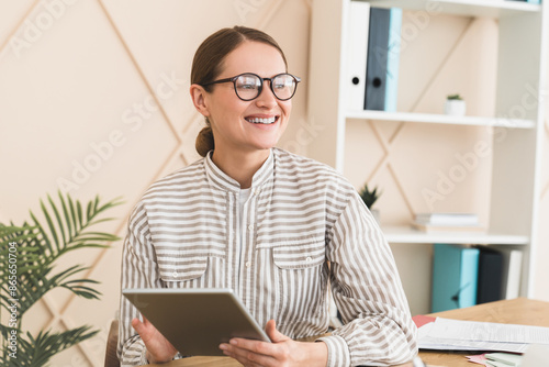 Smiling young successful caucasian businesswoman tutor freelancer teacher using digital tablet, working remotely, preparing for lesson, startup, multitasking