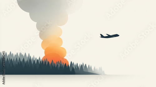smoke, column, forest, aeroplane, minimalist, flat, illustration, rising, scene, tree, fire, silhouette, sky, gradient, landscape, nature, disaster, orange, billowing, calm, abstract, aerial, flight, horizon, shadow, contemporary, emergency, aviation, environment, haze, treetop, peaceful, sunset, design, atmospheric, tranquil, bushfire, muted, temperature, overcast, shades, visual, composition, environmental