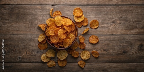 potato chips, bowl, wooden table, topview, potato, chips, snack, junk food, fast food, crunchy, fried food, side dish, food photography, table setting, snack food, wood texture, party food, closeup, salty