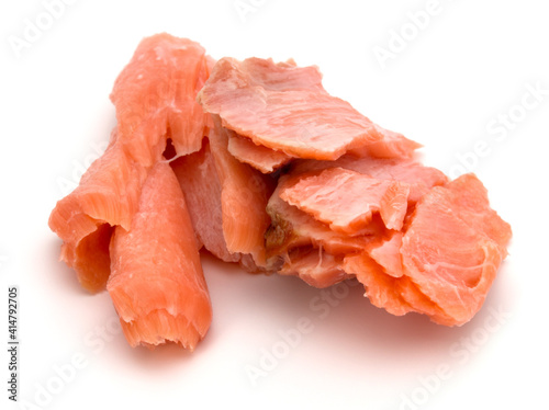 smoked salmon segments isolated on white background cutout. Prepared fish fillet fibres.