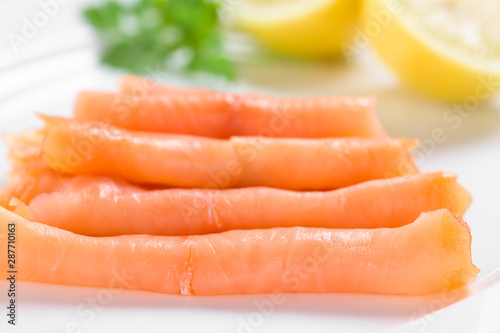 Smoked salmon slices with lemon halves on white plate (Selective Focus, Focus on the front of the first slice)